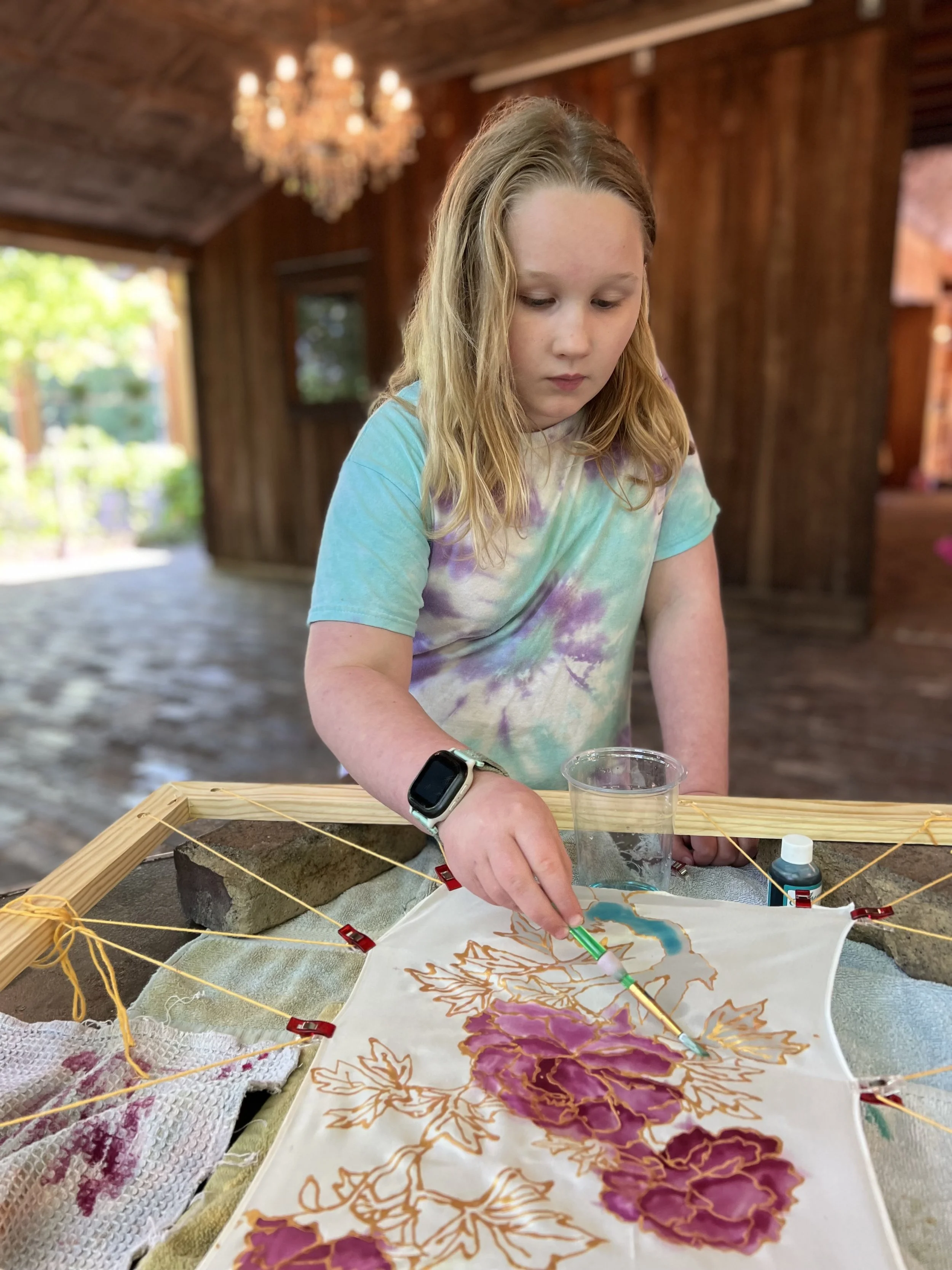 Description: Students will gain exposure to a variety of silk painting and dyeing techniques. For example, students may practice carrageenan marbleizing one day and silk painting with gutta resist the next. Students will learn and create at various points within the Estate, and may incorporate natural elements from the property into some of their pieces (as either media or subject matter).